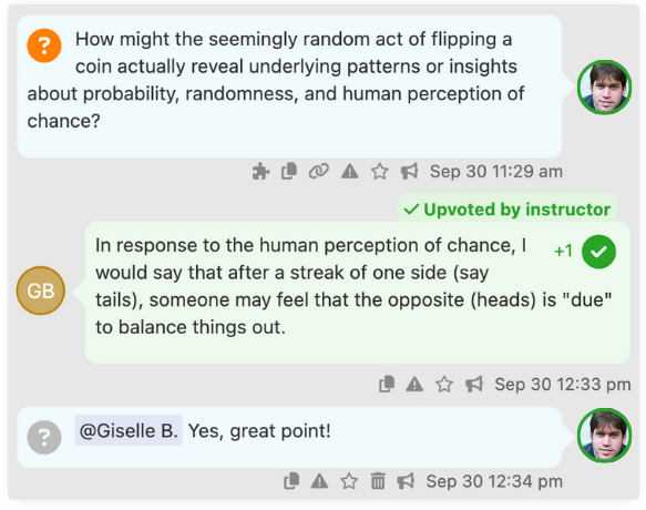 Your (and/or your teaching assistants’) presence inside Perusall can help reinforce to students that you value the course readings (or videos or podcasts) and consider it to be an important part of students’ learning experience. Different instructors have different styles for whether and how they choose to participate in the discussions, and different approaches can be successful. For example, some instructors like to guide discussion or focus attention on specific parts of the content by adding in prompts for students to respond to — you can even require students to respond to a prompt independently before they’ll see other students’ responses to the prompt. I like to upvote good comments (for example, well-written responses to questions from other students) to give students positive feedback and encourage thoughtful responses.