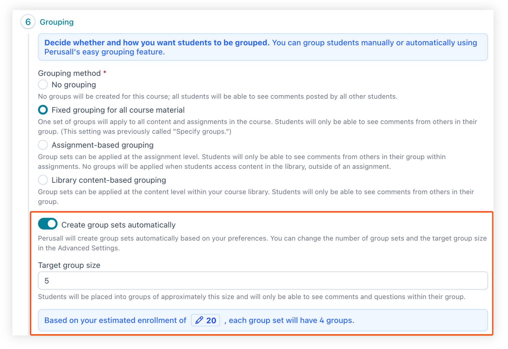 You'll find easy grouping in two places: in Step 6 of the course setup wizard when creating a new course, and anytime afterwards in Settings > Grouping. Simply enter your expected enrollment, and Perusall will distribute students evenly across the number of groups you specify. This works with any grouping method you use (fixed, assignment-based, or content-based), so you can get your course structure in place early and adjust individual groups manually as students enroll.